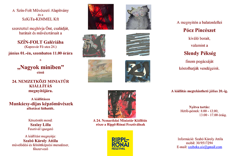 Pál Csaba, “Nagyok Miniben” 24. Nemzetközi Miniatűr Kiállítás, Kaposvár Pál Csaba, Belső történetek 10×10 cm, vegyes, papír Pál Csaba, Hiány, 5×5 cm, vegyes, papír Pál Csaba, Rész 10×5 cm, vegyes, papír Share this: Email a link to a friend (Opens in new window) Email Share on Facebook (Opens in new window) Facebook Share on Pinterest (Opens in new window) Pinterest Share on X (Opens in new window) X Print (Opens in new window) Print Share on Tumblr (Opens in new window) Tumblr Share on LinkedIn (Opens in new window) LinkedIn Share on instagram (Opens in new window) instagram More Share on X (Opens in new window) X Like Loading... Kapcsolódó bejegyzések Leave a comment Δ