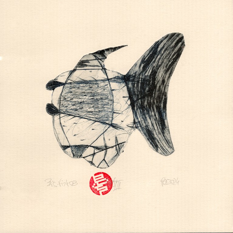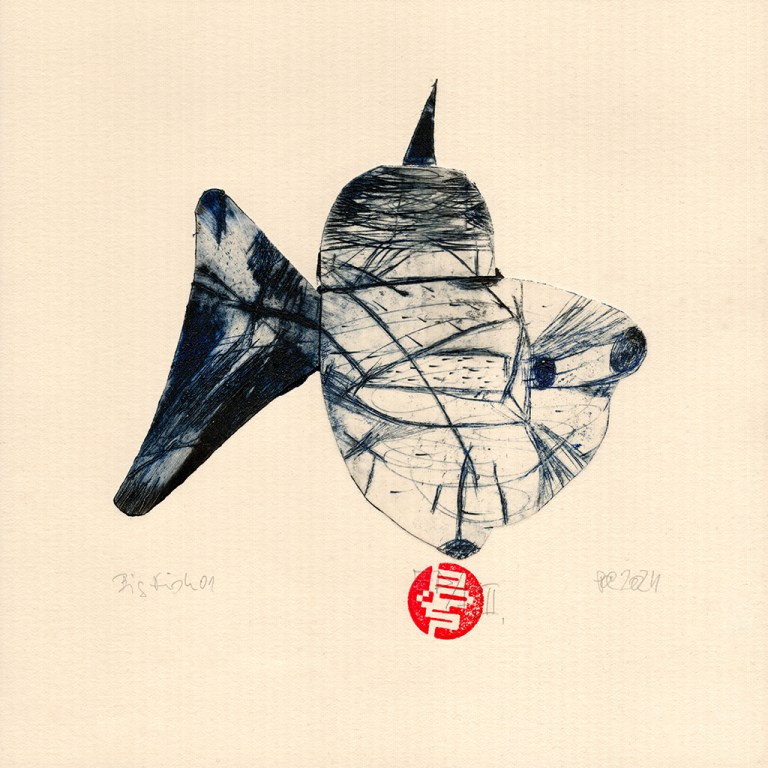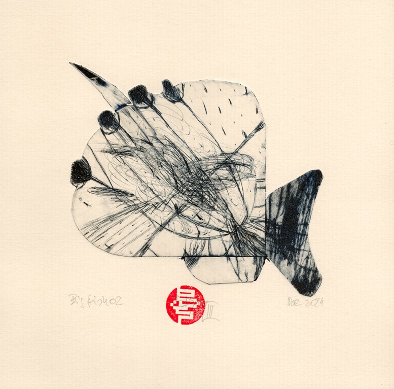 Csaba Pal, Big fish 01, drypoint, 20 x 20 cm
