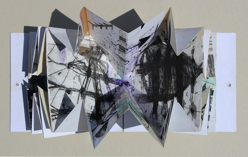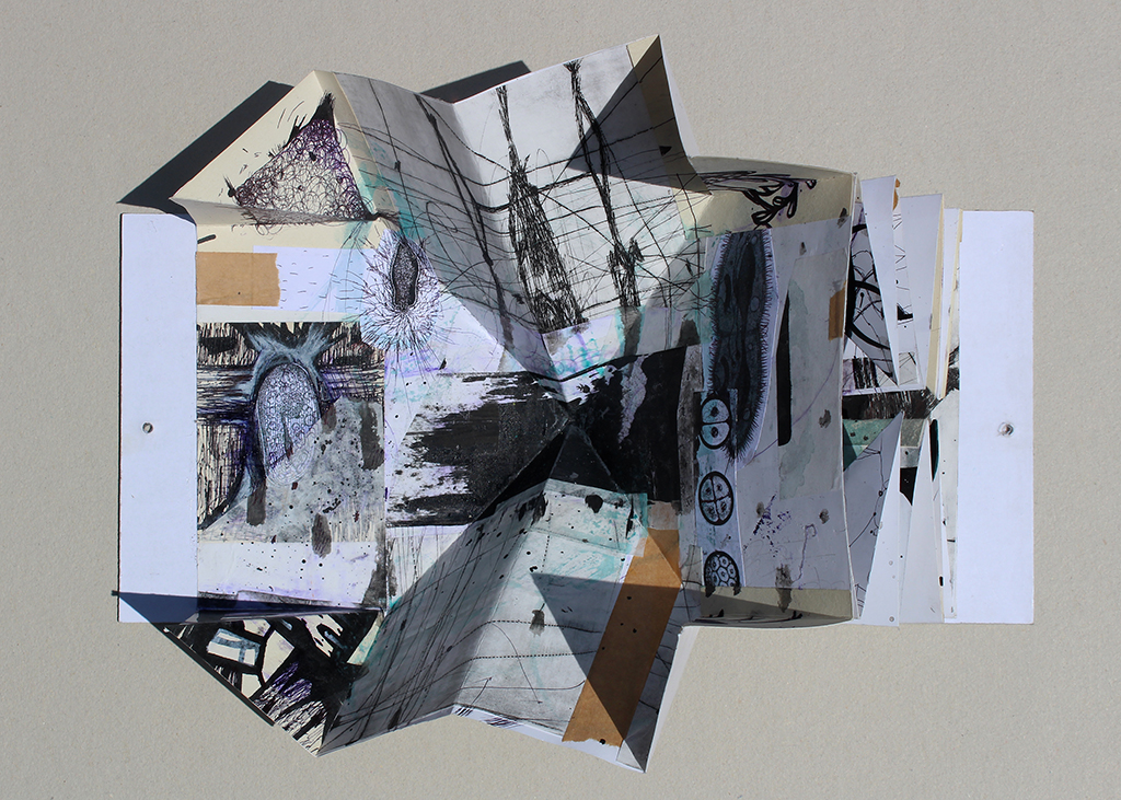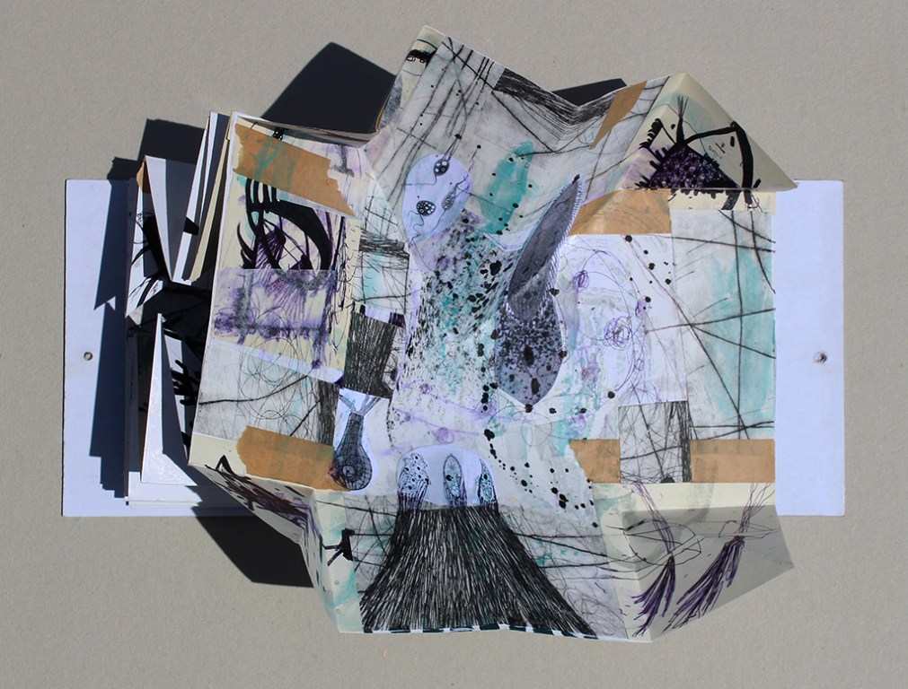 Csaba Pál, End creatures, artist book, open, 20 x 40 x 20 cm, collage mixed on paper, 2025